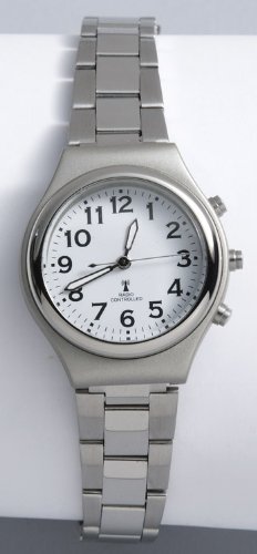 This silver watch is offered with a stainless steel band, sliver-tone plastic case with metal bezel, a white dial with black Arabic numerals, hour markers, and white hour and minute hands. Watch is water resistant to 30 meters, receives the time signal from Boulder, Colorado, and can be set to any US time zone. Case is made from plastic to allow maximum signal strength.